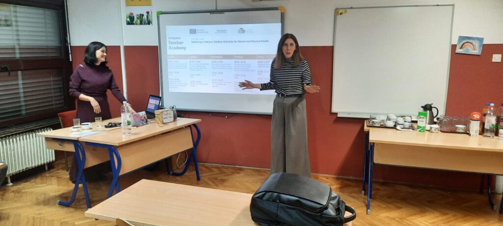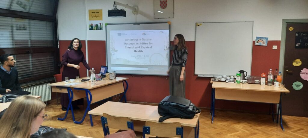 Učiteljica engleskog jezika Ivana Junković i knjižničarka Kristina Varžić sudjelovale su na petodnevnom tečaju u Lisabonu (Wellbein in Nature: Outdoor activities for Mental and Physical Health). Tečaj je trajao od 27.10. – 1. 11. 2025. te je polaznice dodatno osposobio za provođenje aktivnosti vezanih uz poticanje mentalnog zdravlja kroz boravak u prirodi. Na tečaju voditeljice Daniele Ferrera Pinto sudjelovali su i kolege i kolegice iz Italije i Francuske s kojima je ostvarena odlična suradnja i dogovorene buduće aktivnosti. Ciljevi tečaja bili su povećati svijest i znanje o ekološkoj psihologiji i obnavljajućem učinku prirode na dobrobit učenika i nastavnika, izgrađivanje stavova o važnosti uvođenja prirode i aktivnosti usmjerenih na prirodu u školu, istraživanje alata i aktivnosti koje se mogu koristiti u nastavi s učenicima kako bi se oni potaknuli na povezanost s prirodom, smanjili ili spriječili stres, povećali samopoštovanje i socijalne vještine te unaprijedili školski uspjeh. Analizirao se i „biofilični“ dizajn školskog prostora s ciljem unošenja elemenata prirode u učionice te se raspravljalo o konkretnim prijedlozima i rješenjima. Polaznici su se upoznali s konceptom socijalnog i emocionalnog učenja (SEL) i primjenom meditativnih tehnika u nastavi.