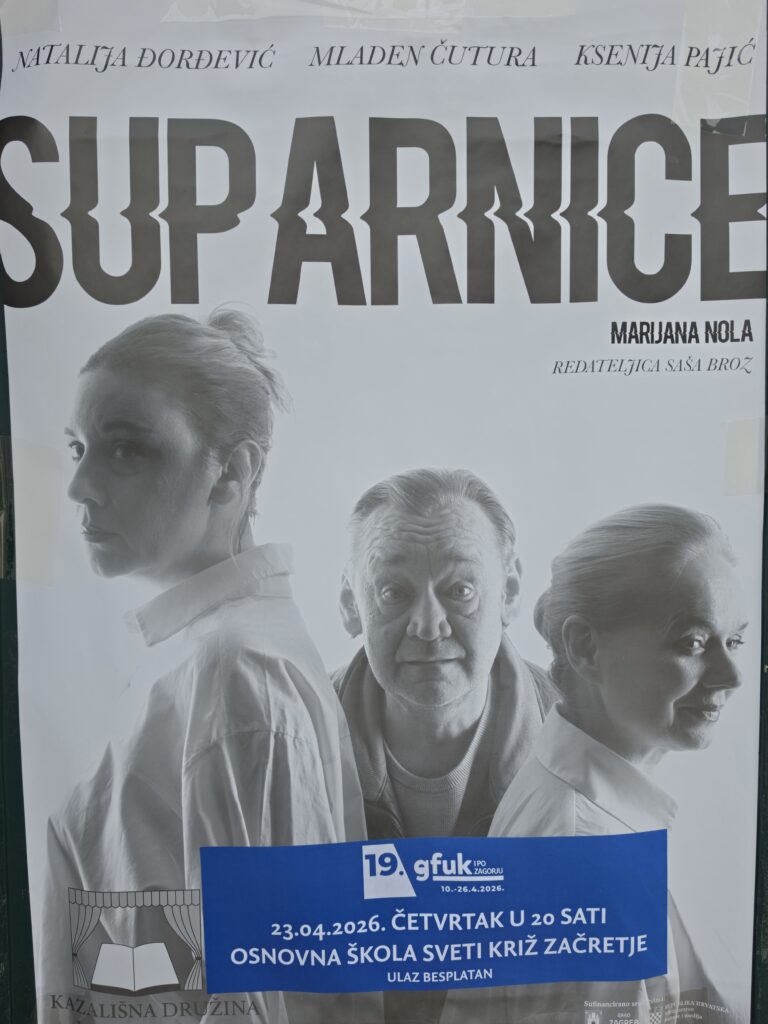 U sklopu Glumačkog festivala GFUK je u našoj školi u četvrtak 23. travnja gostovala predstava Lectirum teatra Suparnice. Igrali su glumci Ksenija Pajić, Natalija Đotrđević i Mladen Čutura, a redateljica predstave je Saša Broz.