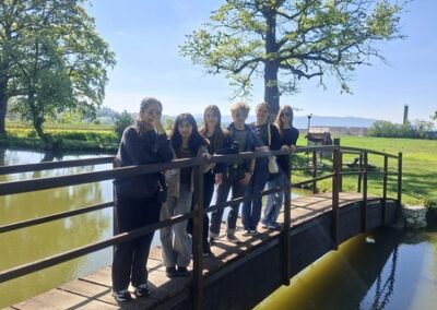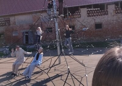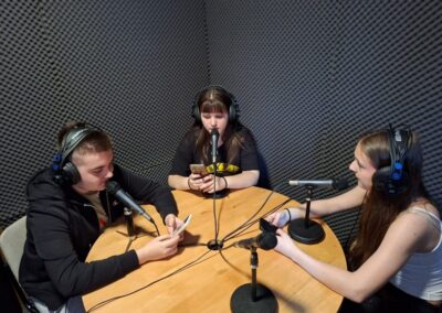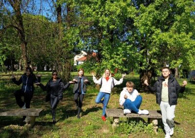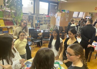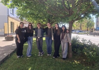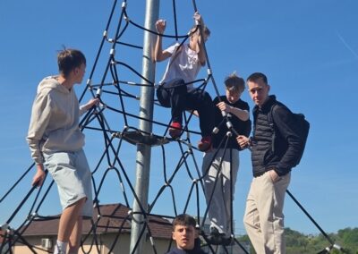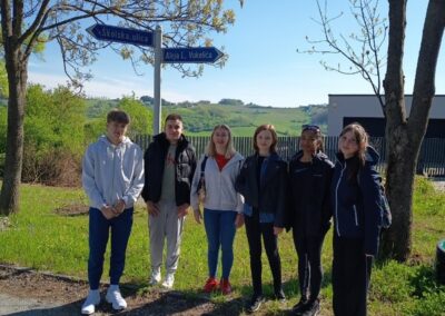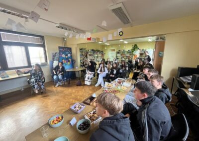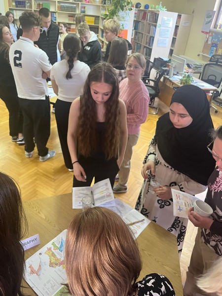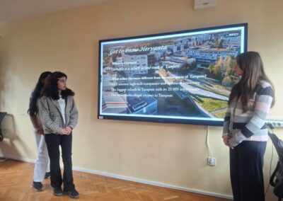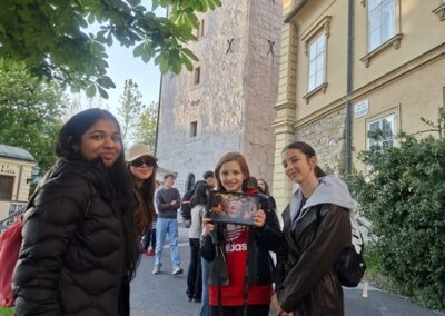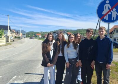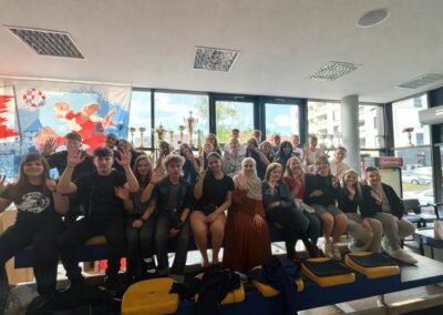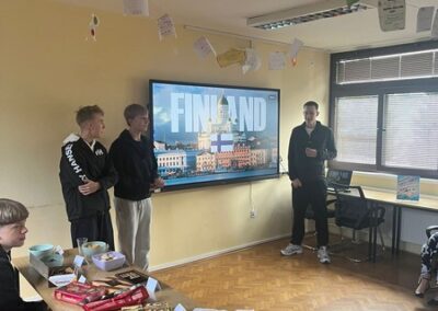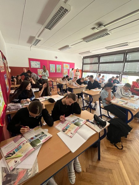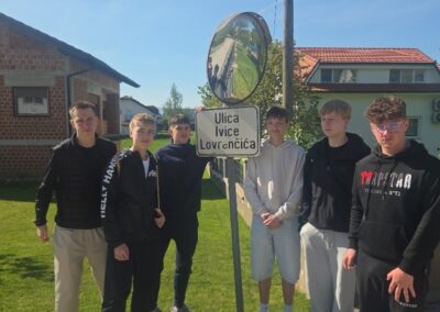 Četvrtak je bio dan za upoznavanje Svetoga Križa Začretja putem aktivnosti lova na blago izrađene u aplikaciji Goose Chase. Učenici podijeljeni u grupe su rješavanjem deset zadataka koji su od njih zahtijevali kretanje mjestom, upoznali kulturnu i povijesnu baštinu Svetoga Križa Začretja. Naši učenici volonteri iskazali su zavidnu razinu znanja o svome mjestu i nisu nimalo prikrivali ponos kojeg osjećaju prema zajednici kojoj pripadaju. Goste su usmjeravali kao da su profesionalni turistički vodiči! Nakon analize pristiglih grupnih odgovora i procjene riješenosti zadataka (koja je bila odlična), uslijedila je aktivnost Reading and Wellbeing povodom manifestacije Noć knjige (upoznavanje s Ivanom Brlić Mažuranić kao hrvatskom najpoznatijom i najprevođenijom književnicom). Istovremeno je u suradnji s Radijskom grupom naše škole snimljena druga radijska emisija u sklopu projekta Move to Groove!. Ovoga puta je na pitanja o mentalnom zdravlju odgovaralo dvoje finskih učenika, a emisija će uskoro biti dostupna putem poveznice na web stranici škole. Svi finski učenici i učiteljice su na kraju druženja u školi dobili poklone od učeničke zadruge “Začretko”. Popodne je cijela grupa gostiju i volontera prisustvovala jednosatnom kolažu hrvatskog filma u kinu u Centru urbane kulture Regenerator te na završnom druženju organiziranom u Kuglani u Zaboku. Oproštajni zagrljaji i tužni pogledi na kraju ove aktivnosti dokaz su uspješnosti posjeta i želje za daljnjom suradnjom.
